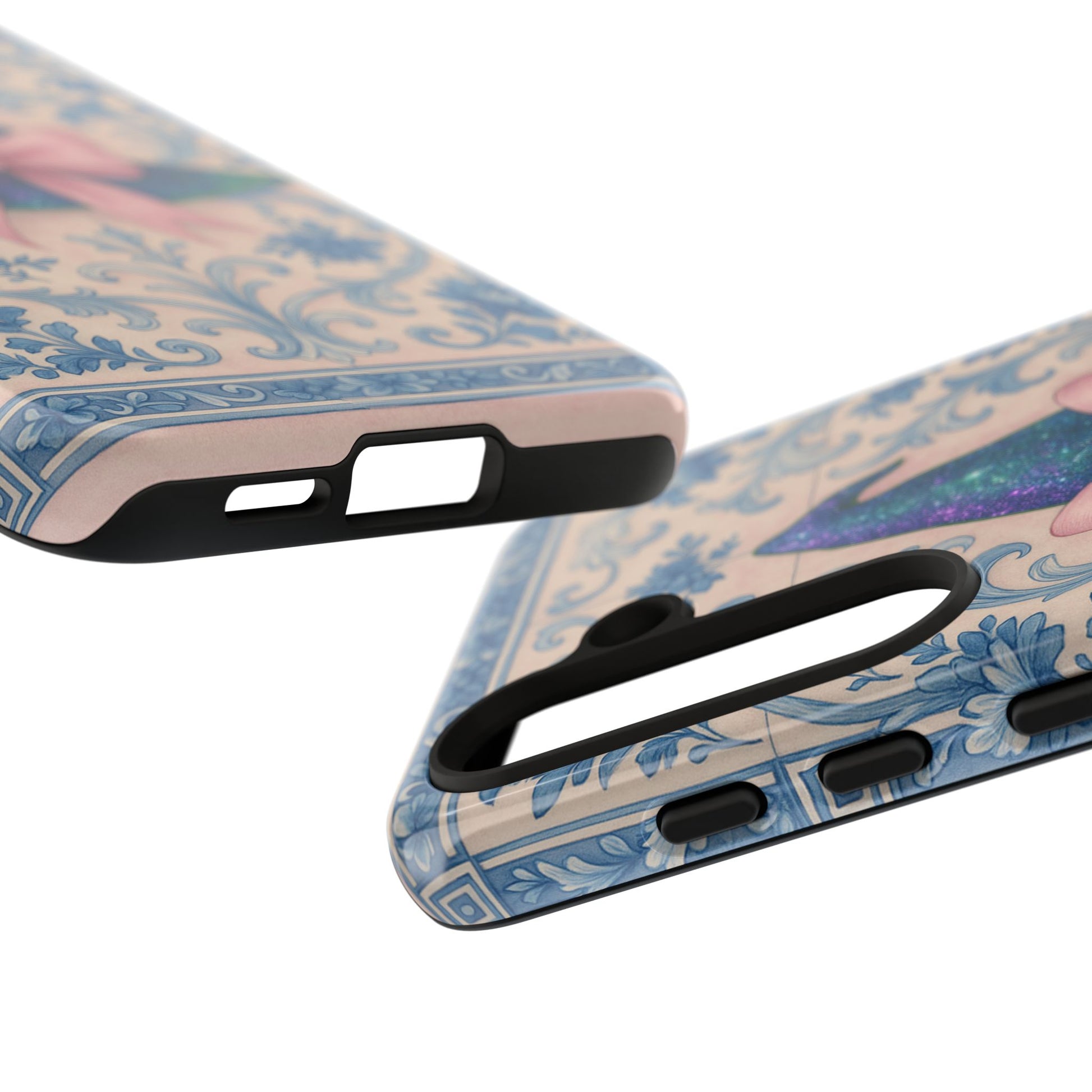 A stylish and protective phone case featuring a Witches Hat with Coquette Pink Bow in Azulejo Style design. Perfect for those looking to add a touch of whimsy and elegance to their everyday tech accessories. Ideal for adults who enjoy unique and eye-catching designs. Relevant for Halloween, costume parties, or everyday use.